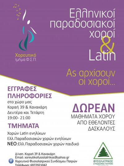Ξεκίνησαν οι εγγραφές στο χορευτικό τμήμα του Φυσιολατρικού Συνδέσμου Πατρών. Όπως αναφέρει σχετική ανακοίνωση, θα λειτουργήσουν τμήματα εκμάθησης Ελληνικών παραδοσιακών χορών καθώς και χορών Latin.