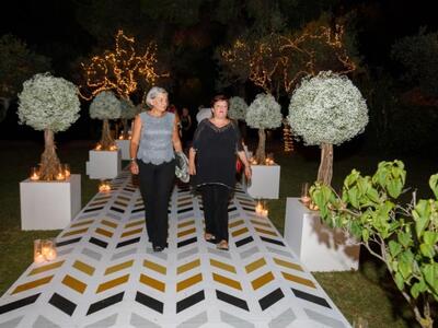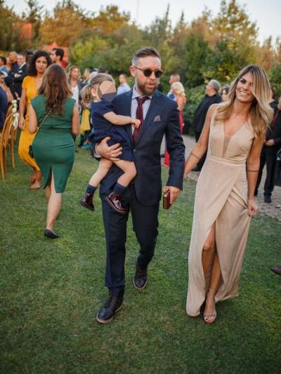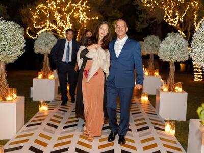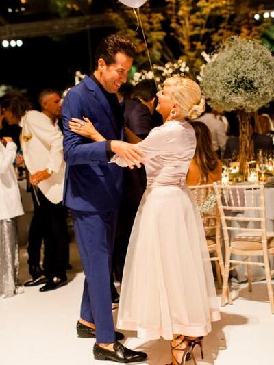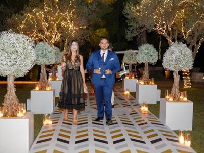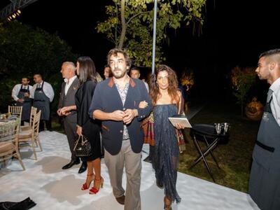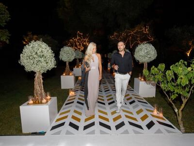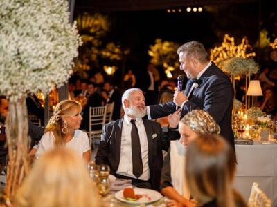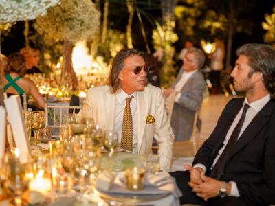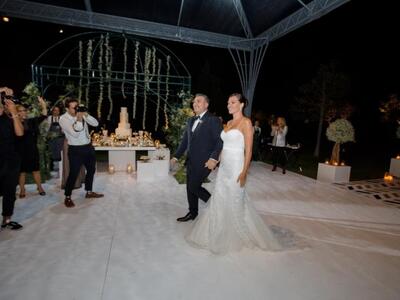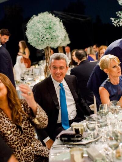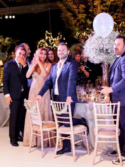 Μετά την τελετή οι καλεσμένοι χαλάρωσαν στο prosseco bar δοκιμάζοντας πεντανόστιμα hors d’oeuvres. Στη συνέχεια οδηγήθηκαν κάτω από στολισμένες αψίδες λουλουδιών που «έκρυβαν» κλασσική μουσική στον χώρο της δεξίωσης όπου στην τεράστια σκηνή που είχε στηθεί πλήθος καλλιτεχνών τραγούδησε για την ευτυχία του ζευγαριού.