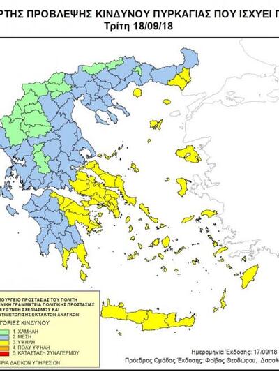 Σύμφωνα με πρόβλεψη της Γενικής Γραμματείας Πολιτικής Προστασίας η περιοχή της Αιγιάλειας, σήμερα Τρίτη 18 Σεπτεμβρίου 2018, βρίσκεται στην κατηγορία κινδύνου 3, όπως φαίνεται στον επισυναπτόμενο ημερήσιο Χάρτη Πρόβλεψης Κινδύνου Πυρκαγιάς. Για το λόγο αυτό οι πολίτες πρέπει να αποφεύγουν εργασίες και ενέργειες που μπορεί να προκαλέσουν πυρκαγιά από αμέλεια, όπως ρίψη αναμμένου τσιγάρου, καύση υπολειμμάτων καλλιεργειών, χρήση μηχανημάτων που μπορούν να προκαλέσουν σπινθήρα, χρήση υπαίθριων ψησταριών κ.α.