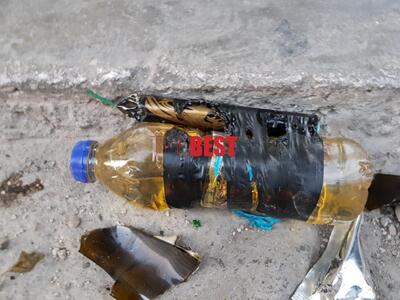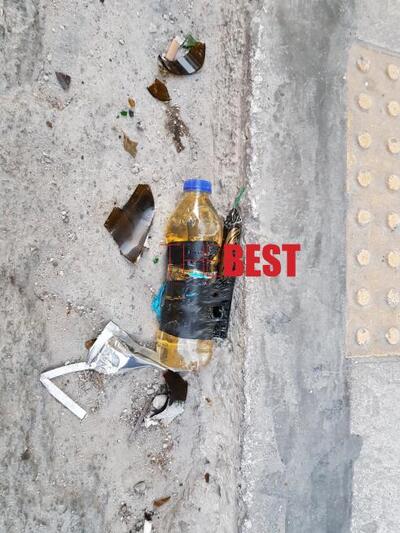 Τουλάχιστον 2 μολότοφ κατέληξαν άθικτες στον δρόμο, χωρίς να σπάσει καν το μπουκάλι με το εύφλεκτο υλικό κι επίσης χωρίς να εκραγεί το δυναμιτάκι που βρισκόταν προσκολλημένο με ταινία στη φιάλη.
