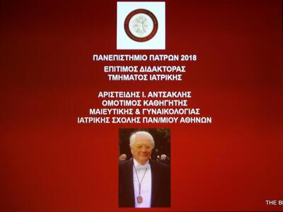 Σε επίτιμο διδάκτορα του Τμήματος Ιατρικής του Πανεπιστημίου της Πάτρας αναγορεύτηκε ο Ομότιμος Καθηγητής Μαιευτικής & Γυναικολογίας της Ιατρικής Σχολής του Εθνικού και Καποδιστριακού Πανεπιστημίου Αθηνών Αριστείδης Αντσακλής.