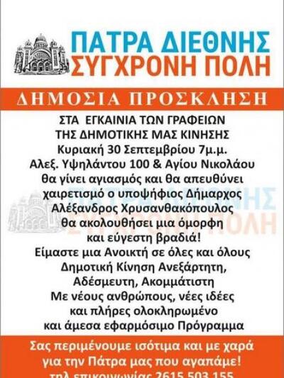 Μ’ έναν πρωτότυπο τρόπο, ένα σκίτσο απευθύνει το κάλεσμα του για τα εγκαίνια των γραφείων του συνδυασμού του, της Δημοτικής Κίνησης "Πάτρα Διεθνής Σύγχρονη Πόλη", ο υποψήφιος Δήμαρχος Πατρέων Αλέκος Χρυσανθακόπουλος, την Κυριακή 30 Σεπτεμβρίου 2018 στις 7 μμ στην Αλεξ. Υψηλάντου 100 και Αγίου Νικολάου.
