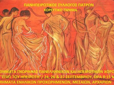 Ο Πανηπειρωτικός Σύλλογος Πατρών συνεχίζει τις εγγραφές στα πολιτιστικά τμήματά του, υποδεχόμενος την ερχόμενη εβδομάδα παλαιούς και νέους φίλους της πανελλήνιας και Ηπειρώτικης μουσικοχορευτικής μας παράδοσης σε συναντήσεις γνωριμίας για ενηλίκους στον άνετο και πλήρως εξοπλισμένο χώρο πολιτισμού με την επωνυμία "Το Σπίτι του Ηπειρώτη" στην οδό Μουρούζη 14 1ος όροφος, μεταξύ πλ. Νόρμαν & Καρόλου στην Πάτρα, τηλ. 2610224995, 6972465709, 6977965689.