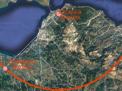 Εικόνα 2: Χάρτης της περιοχής (google maps) στον οποίο διαγράφεται ο κύκλος ακτίνας 30 km (απόσταση του επικέντρου από τον σταθμό του Αρσακείου) και η θέση στην οποία εκτιμήθηκε ότι βρίσκεται το επίκεντρο βάσει της κατευθυντικότητας των σεισμικών κυμάτων (30km ΝΔ του Αρσακείου).