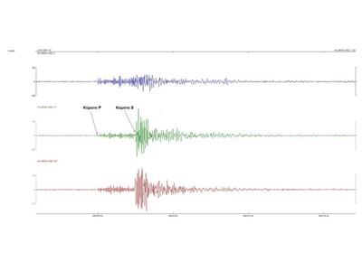 Εικόνα 3: Το σεισμόγραμμα στις τρεις συνιστώσες (κατακόρυφη, Βοράς-Νότος και Ανατολή-Δύση) και οι αφίξεις των P και S σεισμικών κυμάτων.