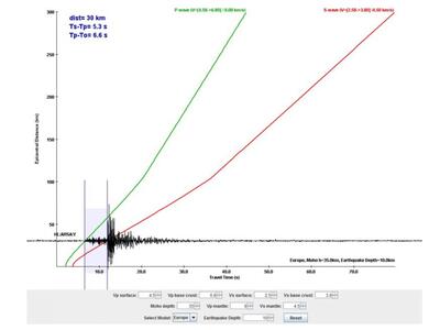 Εικόνα 1: Διάγραμμα από το οποίο πραγματοποιήθηκε η εκτίμηση της απόστασης του επικέντρου από τον σταθμό του Αρσακείου (περίπου 30 km) βάσει της διαφοράς του χρόνου άφιξης των σεισμικών κυμάτων P και S.