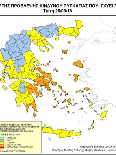Σύμφωνα με πρόβλεψη της Γενικής Γραμματείας Πολιτικής Προστασίας η περιοχή της Δυτικής Ελλάδας την Τρίτη 25 Σεπτεμβρίου 2018, βρίσκεται στην κατηγορία κινδύνου 3, όπως φαίνεται στον επισυναπτόμενο ημερήσιο Χάρτη Πρόβλεψης Κινδύνου Πυρκαγιάς. Για το λόγο αυτό οι πολίτες πρέπει να αποφεύγουν εργασίες και ενέργειες που μπορεί να προκαλέσουν πυρκαγιά από αμέλεια, όπως ρίψη αναμμένου τσιγάρου, καύση υπολειμμάτων καλλιεργειών, χρήση μηχανημάτων που μπορούν να προκαλέσουν σπινθήρα, χρήση υπαίθριων ψησταριών κ.α.