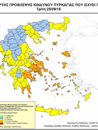 Υψηλός κίνδυνος πυρκαγιάς αναμένεται για σήμερα Τρίτη στη Δυτική Ελλάδα που σύμφωνα με τον ημερήσιο χάρτη πρόβλεψης κινδύνου πυρκαγιάς βρίσκεται στην κατηγορία 3.