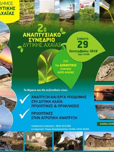 Πεδία και άξονες ανάπτυξης θα αναζητήσει ο Δήμος Δυτικής Αχαΐας στις εργασίες του 2ου Αναπτυξιακού Συνεδρίου που θα πραγματοποιηθεί το Σάββατο 29 Σεπτέμβριου στο 1ο Δημοτικό Σχολείο Κάτω Αχαΐας, σε συνδιοργάνωση με την εφημερίδα «Πελοπόννησος», υπουργεία και πλειάδα θεσμικών και παραγωγικών φορέων. Το πρόγραμμα του συνέδριου, αποτελείται από τις εξής δύο ενότητες: