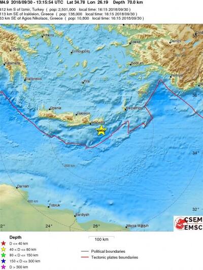 Το επίκεντρο της δόνησης εντοπίζεται 6 χιλιόμετρα ΒΑ της Ζάκρου στην Κρήτη.