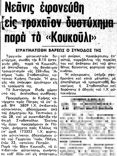 Τραγική σύμπτωση, παιχνίδια της μοίρας, ό,τι και να πει κανείς είναι λίγο για το σπάνιο γεγονός που συνέβη στην οικογένεια του Δημήτρη Σταθόπουλου, από την Κρήνη Πάτρας, που σκοτώθηκε το Σάββατο (29/9) σε τροχαίο δυστύχημα στην Ε.Ο. Πατρών - Πύργου κοντά στη διασταύρωση για την ΒΙ-ΠΕ.