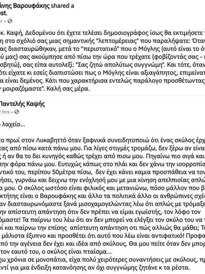 Αγαπητέ κ. Καψή, Δεδομένου ότι έχετε τελέσει δημοσιογράφος ίσως θα εκτιμήσετε την προσθήκη στο σχόλιό σας μιας σημαντικής "λεπτομέρειας" που παραλείψατε: Όταν οι δρόμοι μας διασταυρώθηκαν, μετά το "περιστατικό" που ο Μόγλης (αυτό είναι το όνομα του κουταβιού μας) σας ακούμπησε από πίσω την ώρα που τρέχατε (φοβίζοντάς σας - κάτι που δεν αμφισβητώ), σας είπα αυτολεξί: "Σας ζητώ απολύτως συγγνώμη". Και τότε, όταν παρά το γεγονός ότι είχατε κι εσείς διαπιστώσει πως ο Μόγλης είναι αξιαγάπητος, επιμείνατε ότι έπρεπε να είναι δεμένος. Κάτι που χαρακτήρισα εντελώς παράλογο προσθέτoντας ότι "τον λόφο τον μοιραζόμαστε". Καλή σας μέρα.