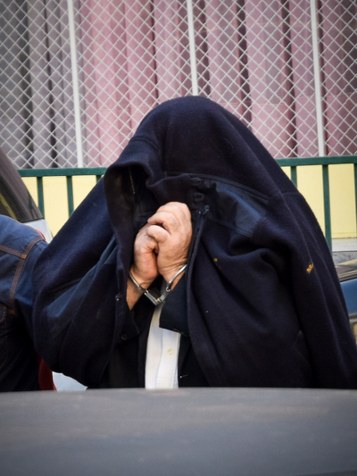 Μπροστά στις κάμερες ο καθηγητής των ΤΕΙ εμφανίστηκε με χειροπέδες αλλά και με ένα μπουφάν στο κεφάλι για να κρύψει τα χαρακτηριστικά του προσώπου του.