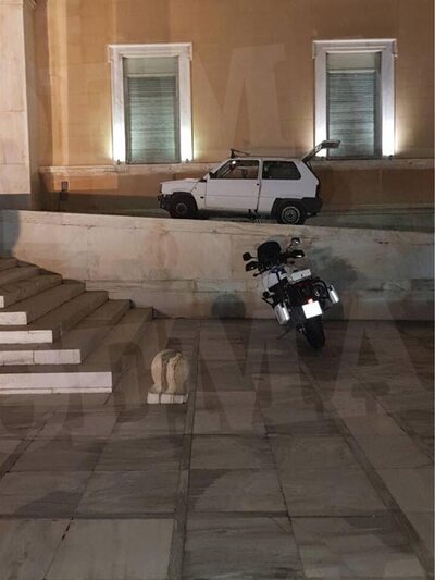 Τελικά, εισέβαλε στο προαύλιο της Βουλής, διέσχισε το μαρμάρινο δάπεδο και τελικά ακινητοποιήθηκε στη στροφή που είναι σχεδόν πάνω από το μνημείο του Αγνώστου Στρατιώτη.