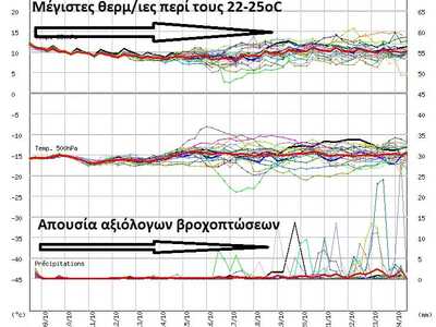 Χαρακτηριστικό το εικονιζόμενο διάγραμμα ensemble, το οποίο αφορά την πόλη της Πάτρας και απεικονίζει την απουσία βροχοπτώσεων στην πόλη τουλάχιστον έως τις 17-18 Οκτωβρίου με τις μέγιστες θερμοκρασίες για το εν λόγω χρονικό διάστημα να φθάνουν μέχρι και τους 25oC κατά μέσον όρο στην πόλη.