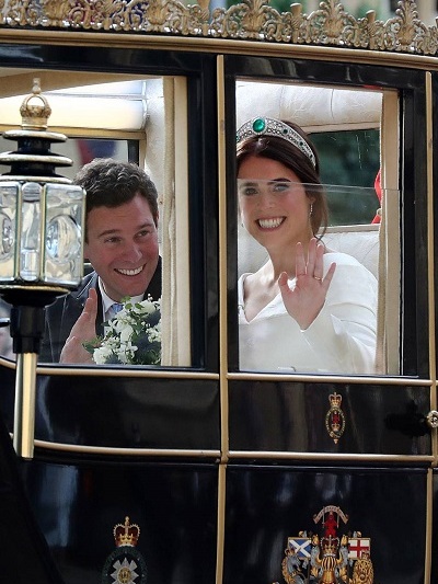 Ακόμα ένας πολύκροτος γάμος στη βρετανική βασιλική φαμίλια καθώς η 28χρονη εγγονή της βασίλισσας, Ευγενία, κόρη του πρίγκιπα Αντριου και διευθύντρια γκαλερί παντρεύτηκε τον αγαπημένο της Tζακ Μπρούκσμπανκ (ambassador της τεκίλα του Τζορτζ Κλούνει) στο παραμυθένιο Windsor Castle. Εννοείται το νυφικό του Peter Pilotto και η δανεική τιάρα της βασίλισσας Ελισάβετ “Greville Emerald Kokoshnik Tiara”, σχεδιασμένη από το Boucheron το 1919 ήταν στο επίκεντρο των δημοσιευμάτων διεθνώς. Όμως και οι διασημότητες που κατέφθασαν στην τελετή έκαναν το γεγονός πασαρέλα!