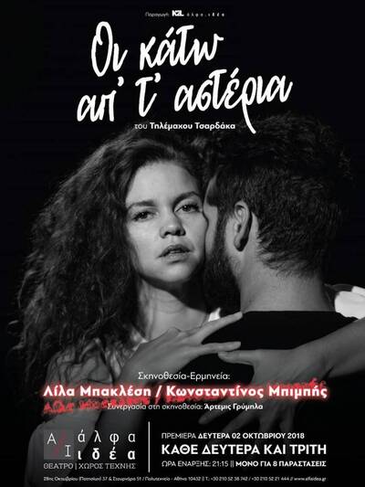 Τέλος μετά από τις sold out παραστάσεις στο act της Πάτρας η Λίλα Μπακλέση μαζί με τον Κωνσταντίνο Μπιμπή «ζωντανεύουν» το εξαιρετικό κείμενο του Τηλέμαχου Τσαρδάκα, «Οι κάτω απ’ τα’ αστέρια» στη σκηνή του Θεάτρου Άλφα.Ιδέα στην Πατησίων, για δέκα μόνο παραστάσεις (από 11/10/2018).