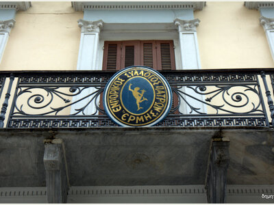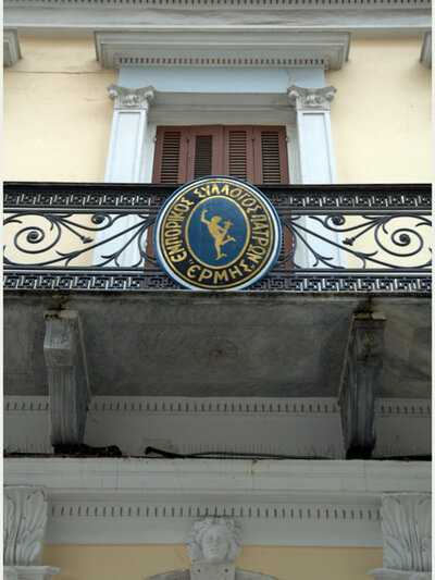 Όπως διαβάζουμε στο Ιστορικό Λεύκωμα της Αχαϊκής Βιομηχανίας του Νίκου Σαραφόπουλου, το 1911 ο Εμπορικός Σύλλογος Πατρών Ερμής, αποφασίζει να αποκτήσει ιδιόκτητη στέγη και επιλέγεται το εντυπωσιακό ακίνητο, στο πάνω μέρος της πλατείας Γεωργίου, που είχε σχεδιαστεί από τον Ερνέστο Τσίλλερ και άνηκε στη Σταφιδική Τράπεζα.