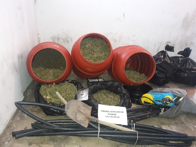 Ειδικότερα, στο πλαίσιο συντονισμένης αστυνομικής επιχείρησης που σχεδίασαν και υλοποίησαν οι αστυνομικοί του Τμήματος Ασφαλείας Ήλιδας, εντοπίστηκαν κρυμμένα κάτω από βλάστηση σε δασική περιοχή, στη Γλύφα Βαρθολομιού, τρία μεγάλα βαρέλια, στα οποία οι δράστες, είχαν αποκρύψει ποσότητα κάνναβης, βάρους 34 κιλών και 255 γραμμαρίων.