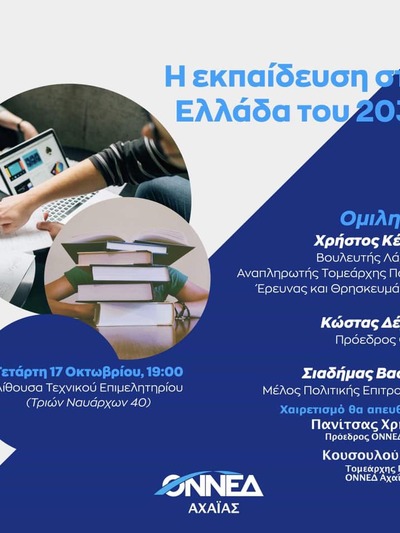 Την Τετάρτη 17 Οκτωβρίου στις 19:00 η ΟΝΝΕΔ Αχαίας πραγματοποιεί εκδήλωση με θέμα: "Η εκπαίδευση στην Ελλάδα του 2030".