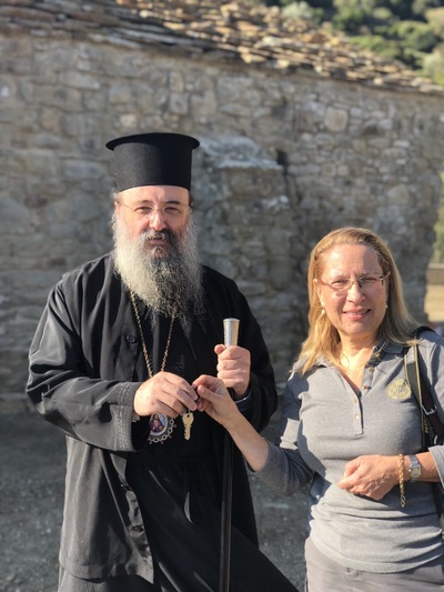 Συγκινητικὴ ἦτο ἡ στιγμὴ κατὰ τὴν ὁποία ἡ κ. Ἀναστασία Κουμούση παρέδωσε στὸν Σεβασμιώτατο τά κλειδιά τοῦ ἱστορικοῦ Ἱεροῦ Ναοῦ.»