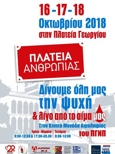 Τριήμερη αιμοδοσία στην πλατεία Γεωργίου της Πάτρας από τις 16 μέχρι και τις 18 Οκτωβρίου. Η κινητή μονάδα αιμοδοσίας του ΠΠΓΝΠ θα βρίσκεται στην πλατεία, προκειμένου όσοι επιθυμούν να δώσουν λίγο από το αίμα τους και να βοηθήσουν με τον τρόπο αυτό, τον συνάνθρωπο τους, που βρίσκεται σε ανάγκη.