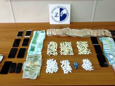 Από την έρευνα σε οικίες και χώρους βρέθηκαν και κατασχέθηκαν πλήθος αυτοσχέδιων συσκευασιών με κοκαΐνη βάρους 400 γραμμαρίων, ποσότητα MDMA βάρους 7,2 γραμμαρίων, τα χρηματικά ποσά των 43.065 ευρώ, 47.000 λεκ Αλβανίας και 286 δολαρίων ΗΠΑ, ζυγαριά ακριβείας, πέντε αυτοκίνητα, μοτοσυκλέτα, δεκαεπτά κινητά τηλέφωνα και διάφορες σημειώσεις αγοραπωλησίας ναρκωτικών.