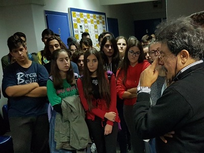 O ποιητής συνομιλεί με τους μαθητές.