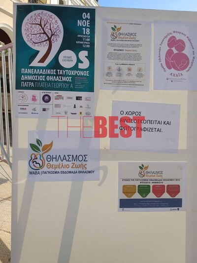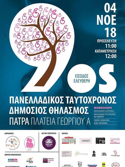 Περισσότερες από 60 μητέρες θήλασαν δημόσια τα παιδιά τους την Κυριακή στην πλατεία Γεωργίου της Πάτρας στο πλαίσιο του 9ου δημόσιου μητρικού θηλασμού, που πραγματοποιείται ταυτόχρονα σε όλες τις μεγάλες πόλεις της χώρας υπό τη διοργάνωση του Πανελλήνιου Δικτύου Εθελοντικών Ομάδων Μητρικού Θηλασμού και Μητρότητας.