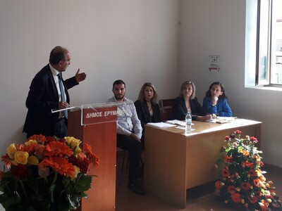 Ο Δήμαρχος στο δικό του χαιρετισμό, αφού καλωσόρισε τους παρευρισκόμενους, αναφέρθηκε στις μεγάλες προσπάθειες που κατέβαλαν από κοινού, τόσο ο Δήμος, όσο και η Περιφέρεια, για την ίδρυση και λειτουργία του Κέντρου, δεδομένου ότι δεν πληρούσε η περιοχή τα πληθυσμιακά κριτήρια που είχαν τεθεί αρχικά από το Υπουργείο για την έγκρισή του, μην παραλείποντας να ευχαριστήσει προσωπικά τον Περιφερειάρχη για την συμβολή του.