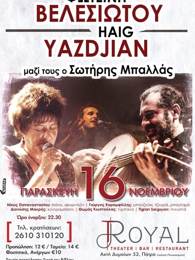 Δύ ο πολύ μεγάλους καλλιτέχνες θα έχουν την ευκαιρία να απολαύσουν οι Πατρινοί στις 16 Νοεμβρίου. Φωτεινή Βελεσιώτου και Χάϊκ Γιαζιτζιάν ανεβαίνουν στην κεντρική μουσική σκηνή του Royal για να μας χαρίσουν μια βραδιά που θα μείνει αξέχαστη!