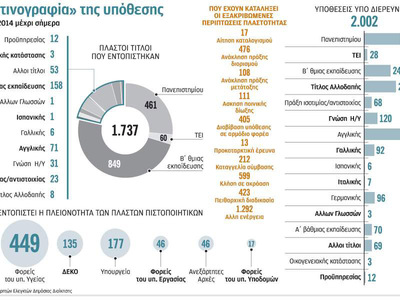 Οπως προκύπτει από τα στοιχεία, 2.002 υποθέσεις με σοβαρές ενδείξεις πλαστότητας τίτλων βρίσκονται υπό διερεύνηση. Η πλειονότητά τους αφορά πτυχία αγγλικών (567), πανεπιστημίων (333), τίτλους αλλοδαπής (288), πτυχία δευτεροβάθμιας εκπαίδευσης (240), γνώση Η/Υ (120), πτυχία γερμανικών (96) και γαλλικών (92) αλλά και πτυχία πρωτοβάθμιας εκπαίδευσης (70).