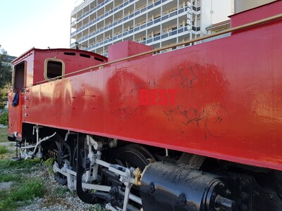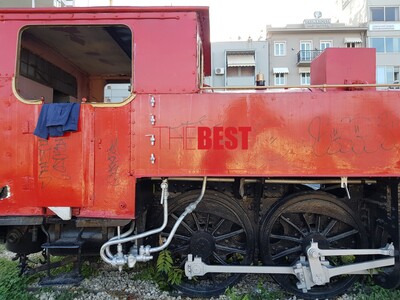 Κάποιοι έχουν γράψει συνθήματα πάνω στις φρεσκοβαμένες επιφάνειες της ιστορικής ατμομηχανής που αν και έγινε μεγάλη προσπάθεια να διασωθεί από την οξείδωση, τα σκουπίδια και τα δεκάδες συνθήματα που είχαν γράψει πάνω της, σήμερα εμφανίζει αυτή την εικόνα.