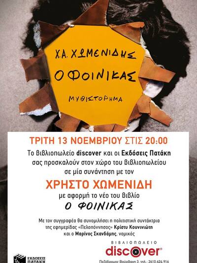 Το βιβλιοπωλείο Discover και οι εκδόσεις Πατάκη παρουσιάζουν απόψε στην Πάτρα το νέο βιβλίο του Χρήστου Χωμενίδη με τίτλο: "Ο φοίνικας". Η εκδήλωση θα πραγματοποιηθεί στις 20:00 στο χώρο του βιβλιοπωλείου (πεζόδρομος Βούρβαχη 3).