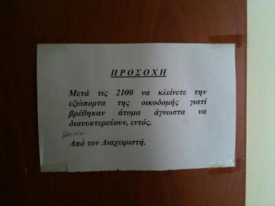 Αν αναλογιστεί κανείς ότι η εγκληματικότητα εχει φτάσει στα ύψη στην περιοχή μας, τότε εύλογα κάποιος θα δικαιολογήσει αυτή την πρωτοβουλία, που δεν είναι και η πλέον εξυπηρετική, καθώς αν κάποιος δεχθεί την επίσκεψη συγγενικού η φιλικού του προσώπου την ώρα που η κεντρική είσοδος είναι κλειδωμένη, είναι υποχρεωμένος να κατεβεί ο ίδιος για να ανοίξει.