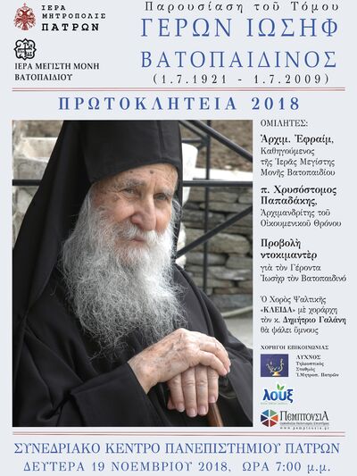 Συνεχίζονται τα Πρωτοκλήτεια 2018 που διοργανώνει η Ιερά Μητρόπολη Πατρών και την Δευτέρα 19/11/2018 στις 19.00, σε συνεργασία με την Ιερά Μεγίστη Μονή Βατοπαιδίου του Αγίου Όρους, διοργανώνει εκδήλωση, όπου θα παρουσιαστεί το βιβλίο του Αρχιμανδρίτη Εφραίμ, Καθηγουμένου της Ι.Μ. Μονής Βατοπαιδίου, με τίτλο «Γέρων Ιωσήφ Βατοπαιδινός (1.7.1921 – 1.7.2009)».