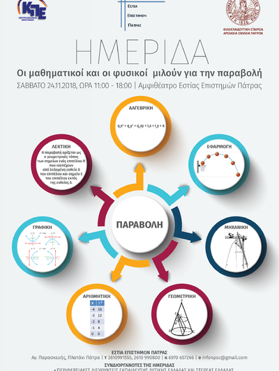 Ημερίδα συνδιοργανώνουν το Αρσάκειο Λύκειο Πατρών και η Εστία Επιστημών, το Σάββατο 24 Νοεμβρίου στο Αμφιθέατρο της Εστίας Επιστημών Πάτρας, με θέμα: "Οι µαθηµατικοί και οι φυσικοί µιλούν για την παραβολή".