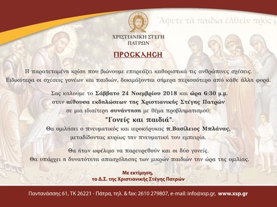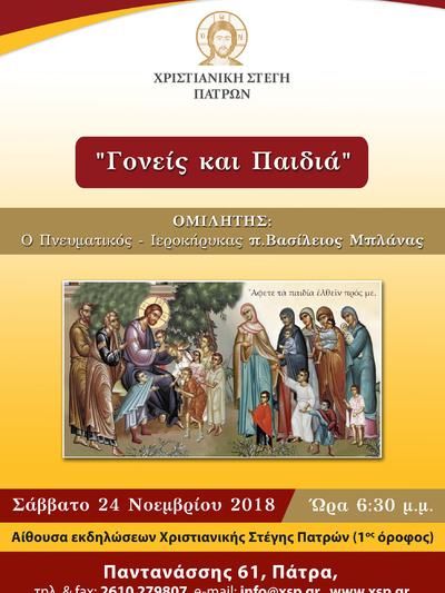 Εκδήλωση - Συνάντηση με θέμα "Γονείς & Παιδιά" με ομιλητή τον πνευματικό και Ιεροκήρυκα της Ιεράς Μητροπόλεως Πατρών, Αρχιμανδρίτη π. Βασίλειο Μπλάνα, θα πραγματοποιηθεί το Σάββατο 24 Νοεμβρίου 2018 στις 18.30 το απόγευμα, στην κεντρική αίθουσα εκδηλώσεων της Χριστιανικής Στέγης Πατρών, στην οδό Παντανάσσης 61.