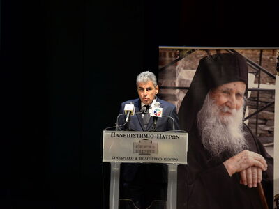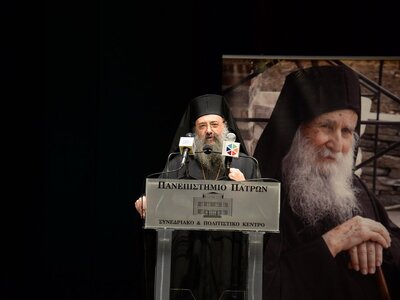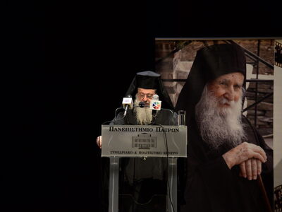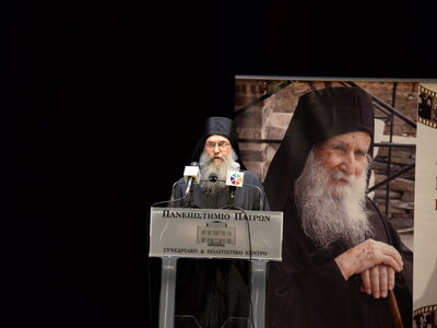 Ὁ Σεβασμιώτατος Μητροπολίτης Πατρῶν κ.κ. Χρυσόστομος στὸ σύντομο χαιρετισμὸ πού ἀπηύθυνε μίλησε γιά τόν Ὀρθόδοξο καί δή γιά ἁγιορείτικο Μοναχισμό τόν ὁποῖον ὑπηρέτησε μετά ζεούσης καρδίας ὁ ἀοίδιμος Γέροντας Ἰωσήφ ὁ Βατοπαιδινός, τόν ὁποῖον ἐμακάρισε γιὰ τὴν ἀσκητική βιοτὴ καὶ πολιτεία του.