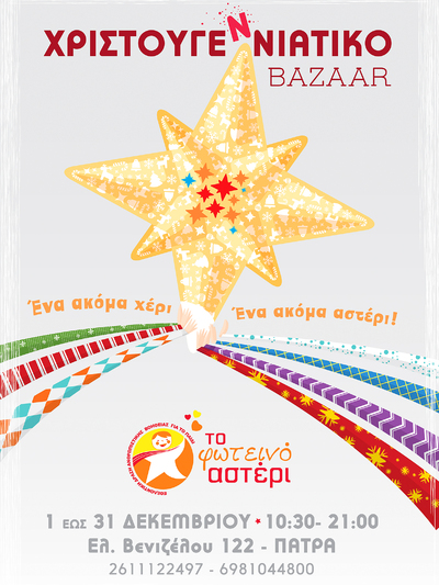 Ξεκινά αύριο και θα διαρκέσει μέχρι το τέλος του Δεκεμβρίο το χριστουγεννιάτικο μπαζάρ του Φωτεινού Αστεριού στα γραφεία του στην Ελευθερίου Βενιζέλου.