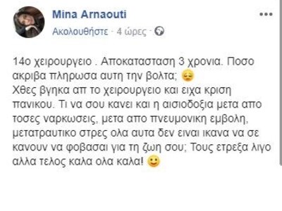 Στο 14ο χειρουργείο υποβλήθηκε η Μίνα Αρναούτη η οποία τρία ολόκληρα χρόνια μετά το τροχαίο που στοίχισε τη ζωή στον δημοφιλή τραγουδιστή Παντελή Παντελίδη προσπαθεί να συνέλθει. Με ανάρτησή της στο facebook αποκαλύπτει ότι μετά το χειρουργείο υπέστη κρίση πανικού.