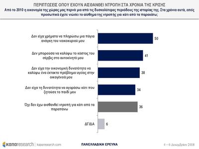 Μάλιστα το 50% έχει αισθανθεί ντροπή στα χρόνια της κρίσης για το γεγονός ότι δεν είχε χρήματα για να πληρώσει μια πάγια ανάγκη του νοικοκυριού του. Το 41% ντράπηκε γιατί δεν μπορούσε να κάνει σέρβις στο αυτοκίνητο ενώ το 38% αισθάνθηκε ντροπή καθώς δεν μπορούσε οικονομικά να καλύψει ένα έκτακτο πρόβλημα υγείας στην οικογένειά του.