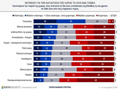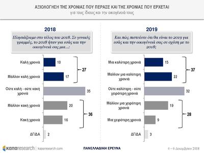 Συγκεκριμένα για το 36% των ερωτηθέντων το 2018 ήταν μια κακή και μάλλον κακή χρονιά. Για το 27% ήταν μια καλή και μάλλον καλή χρονιά. Για το 2019, το 37% εκτιμά ότι θα είναι ένας καλύτερος και μάλλον καλύτερος χρόνος ενώ το 28% θεωρεί ότι θα είναι μια χειρότερη και μάλλον χειρότερη χρονιά.