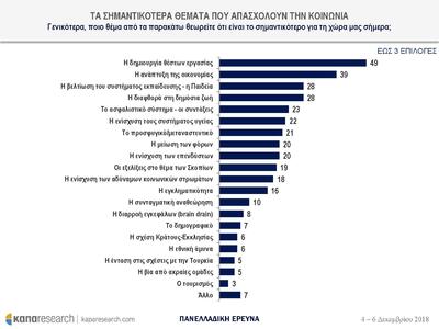 Η δημιουργία νέων θέσεων εργασίας ιεραρχήθηκε πρώτο στη λίστα με τα σημαντικότερα θέματα για τη χώρα, από το 49% των ερωτηθέντων. Στις πολύ χαμηλές θέσεις βρίσκονται οι σχέσεις κράτους εκκλησίας, το δημογραφικό, η βία από ακραίες ομάδες.