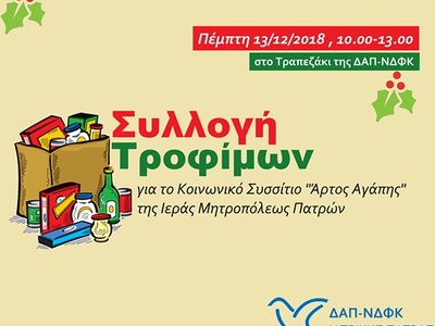 Σημείο συλλογής είναι το Τραπεζάκι της ΔΑΠ-ΝΔΦΚ ΙΑΤΡΙΚΗΣ ΠΑΤΡΑΣ την Πέμπτη 13 Δεκεμβρίου 2018, 10.00-13.00.»