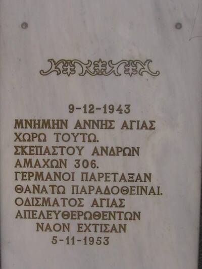 Εμείς αργότερα, εδώ στο χωριό, αποδίδοντας τη σωτηρία μας στην Αγία Άννα –με πρωτεργάτη τον Βασίλειο Τέτοκα-ανεγείραμε στη μνήμη της ένα εκκλησάκι στο χώρο συγκέντρωσής μας από τους Γερμανούς.