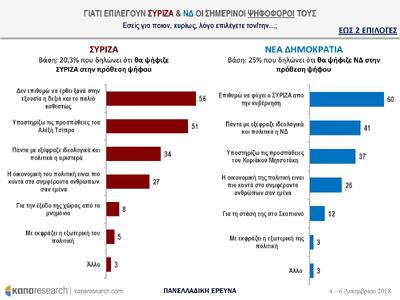 Ας δούμε τώρα τους λόγους για τους οποίους πρότίθενται να επιλέξουν ΣΥΡΙΖΑ και ΝΔ, οι σημερινοί ψηφοφόροι τους. Όπως προκύπτει ο πρώτος λόγος είναι αντιστοίχως , για να μην ξανάρθει στην κυβέρνηση η δεξιά και το παλιό καθεστώς, αλλά και για να φύγει ο ΣΥΡΙΖΑ από την κυβέρνηση.