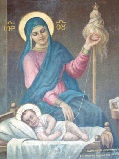 Είναι μία από τις σπανιότερες εικόνες της Παναγίας, όπου ως Μητέρα του Κυρίου, Τον κανακεύει σαν μωρό και γνέθει για να Του πλέξει ρουχαλάκια.