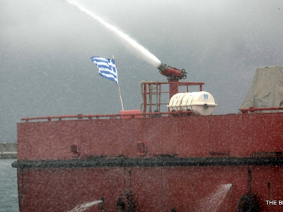 To πυροσβεστικό πλοίο «Παύλος Σκούρτης» αποπλέει από τον βόρειο λιμένα της Πάτρας και το πλήρωμά του ενεργοποιεί τα συστήματα ρίψης νερού, το οποίο σε ύψος μπορεί να φτάσει τα 25 μέτρα. Επίσης σε λειτουργία τίθεται και το σύστημα δικής του πυροπροστασίας και το νερό αρχίζει να εκτοξεύεται και από τα πλαϊνά του πλοίου.