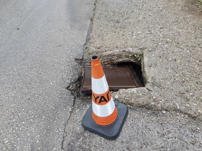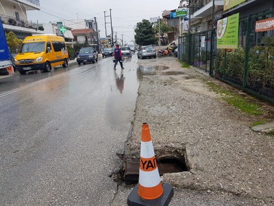 Επικίνδυνες λακκούβες ξεφυτρώνουν κάτω από καπάκια της ΔΕΥΑΠ και όχι μόνο, ανα την πόλη. Ένα ακόμη επικίνδυνο για πεζούς αλλά ακόμη δικυκλιστές και οδηγούς οχημάτων -καθώς βρίσκεται στα όρια της οδού Πανεπιστημίου στο ύψος των Μποζαϊτίκων- οριοθετείται με μια κορίνα και αποτελεί παγίδα για τους διερχόμενους.